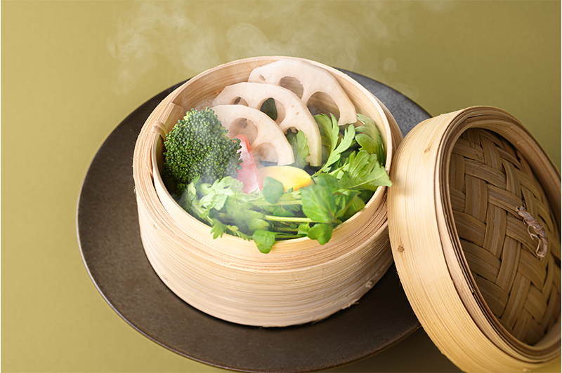 栃木県産野菜のセイロ蒸し 野菜本来の味を引き立てる醤油ベースのシンプルなHALOWオリジナル中華ダレで味わう蒸籠蒸し野菜(蓮根、ブロッコリー、春菊など) 提供店舗/「都シティ 大阪本町 モダンチャイニーズブラッセリーHALOW」情報へ
